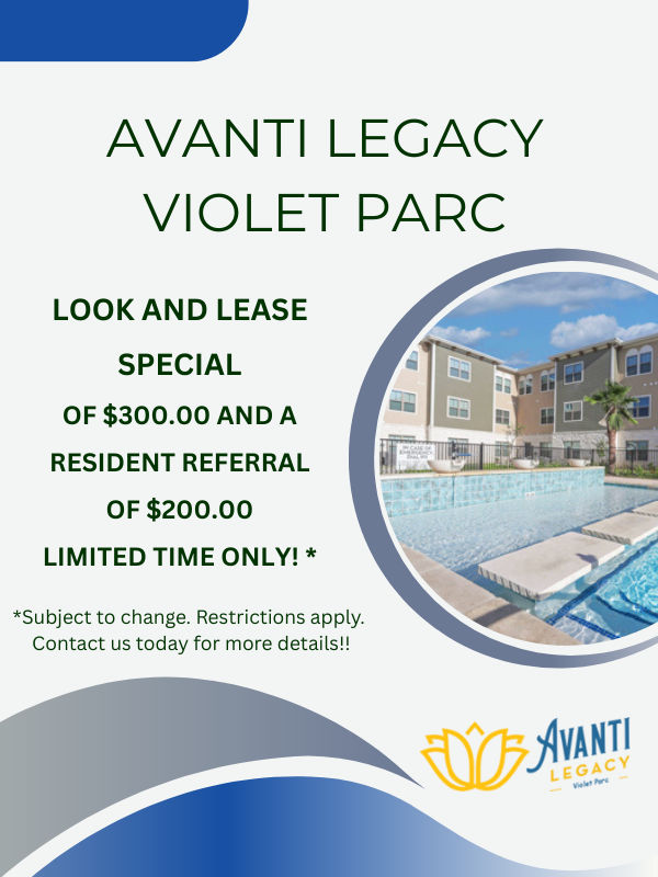 Avanti Legacy Violet Parc offers quality features and amenities. From our state-of-the-art fitness center, to our luxury resort-style swimming pool, we offer amenities sure to win your approval.